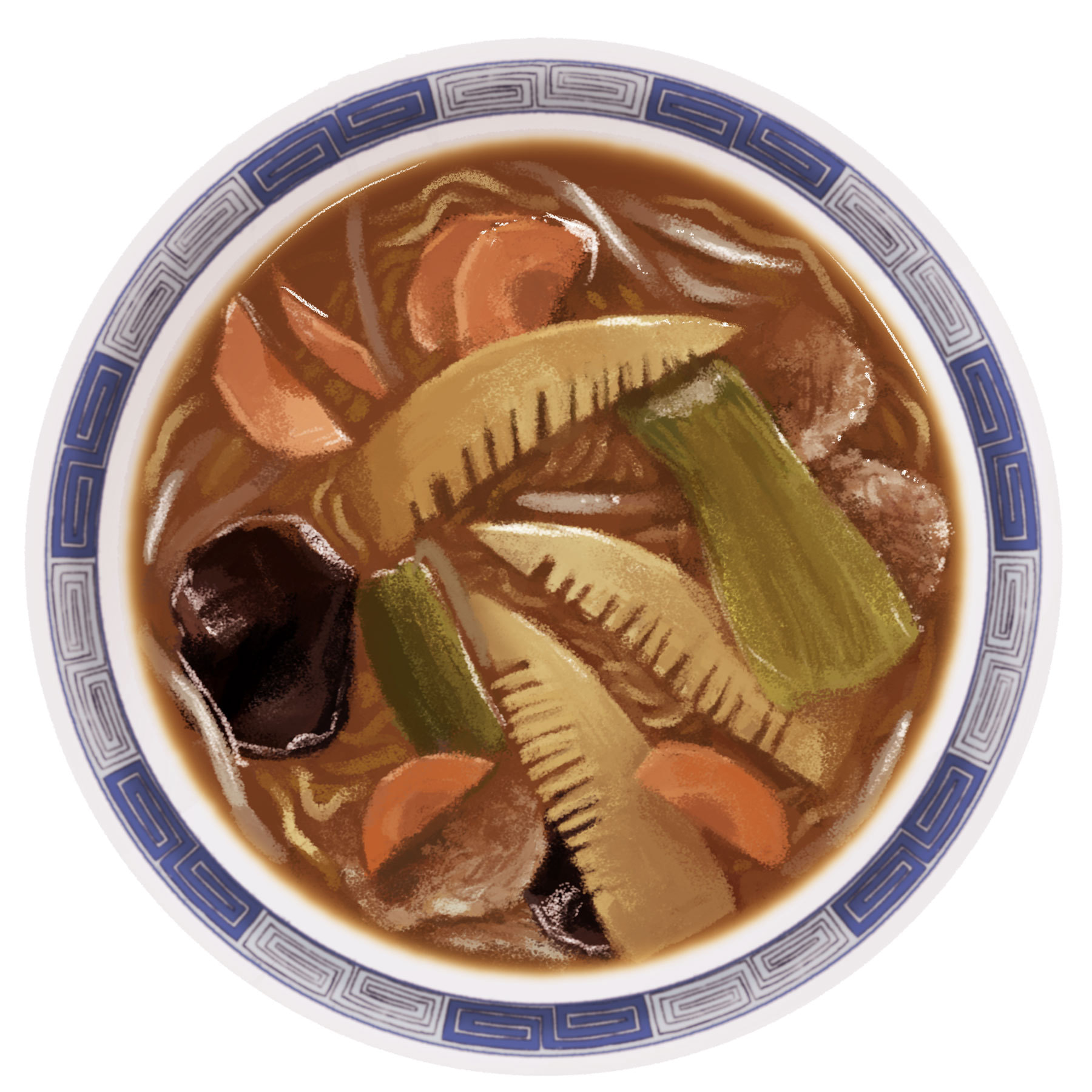 大ぶりの具材が食欲をそそるおいしい麺。とろみのある醤油ベースのスープは、背脂の旨味が際立ちます。もっちりとした手もみの縮れ麺と絡めてご賞味ください。