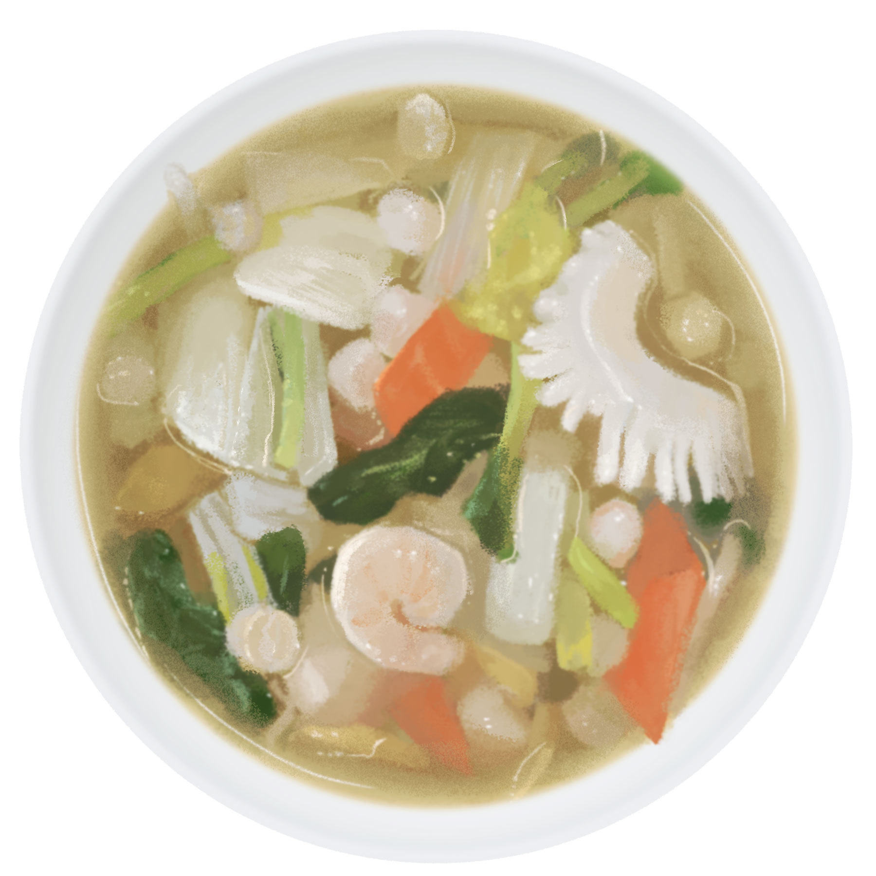 あっさり、とろ〜りの熱々スープから顔を覗かせる色とりどりの野菜と海鮮のラーメン。なんとスープは10時間かけて鶏からとったダシを使用。希少な鶏だけを使用することによって、うまみやダシの出る量が全く違ってくるのだとか。